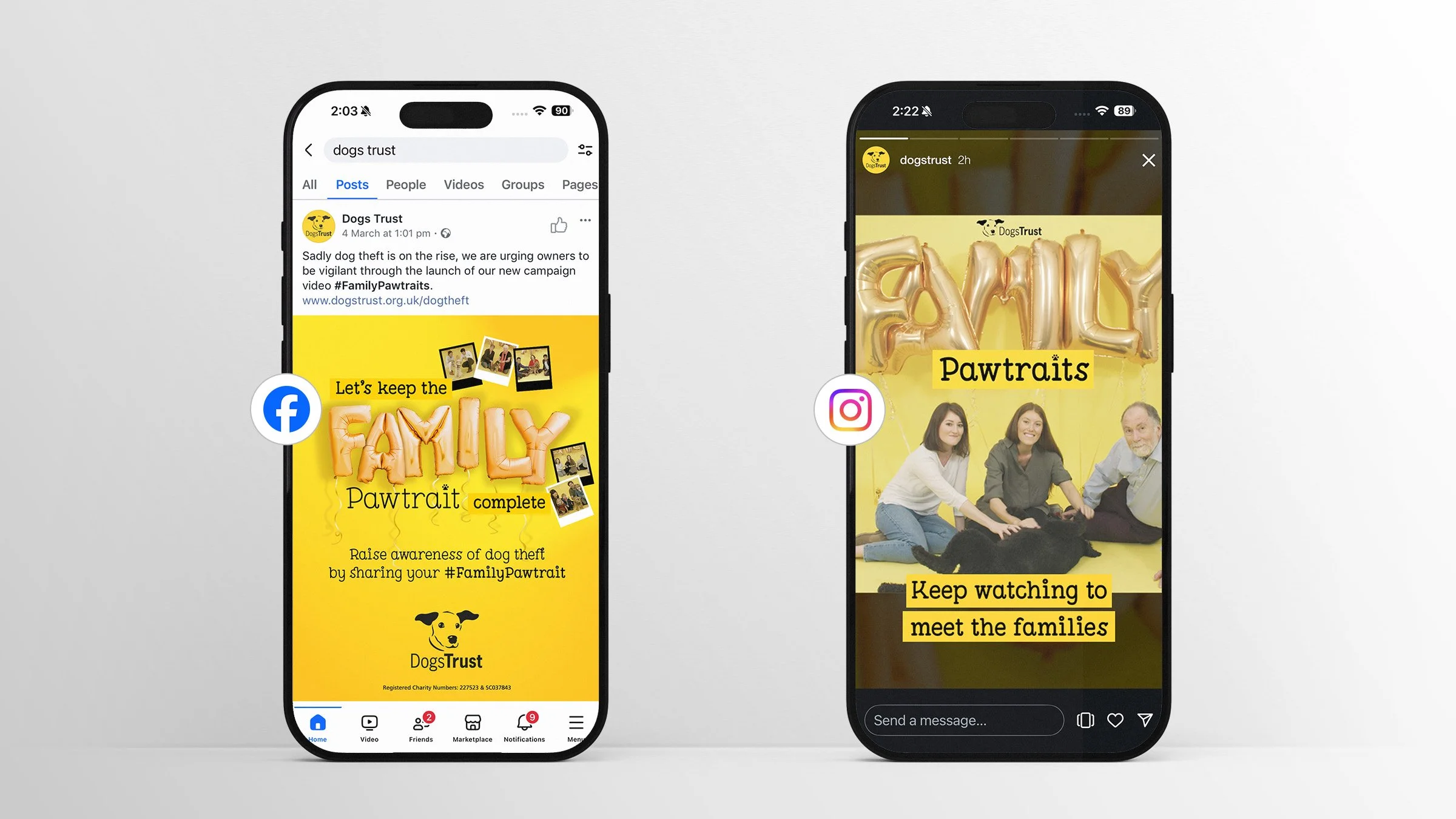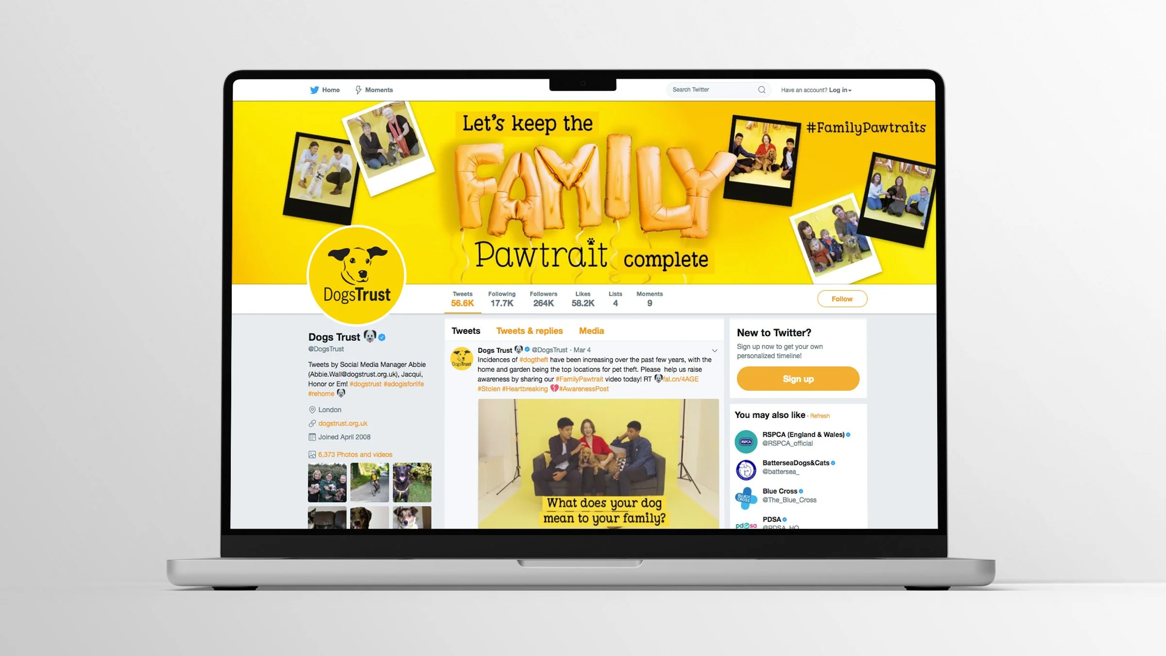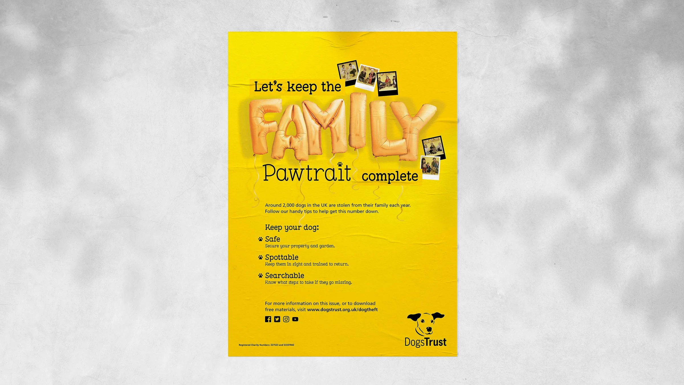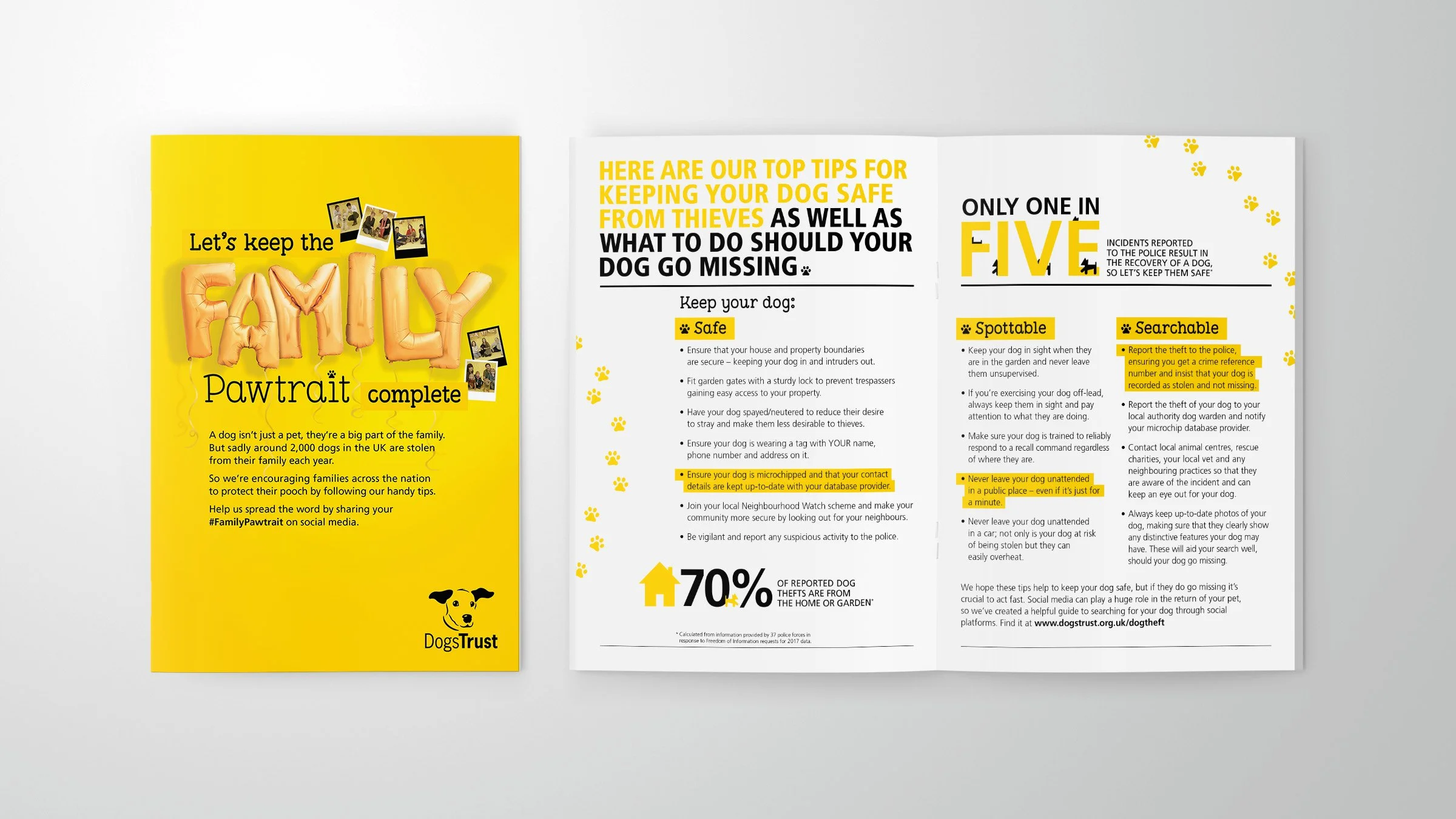 I designed a range of deliverables to support a film on the Dogs Trust website, encouraging people to keep the #FamilyPawtrait complete. Posters and factsheets could be downloaded, giving advice to people on how to keep their dog safe, and what to do should their dog go missing. We raised awareness on social media, creating an Instagram story and taking over the Dogs Trust Twitter page.