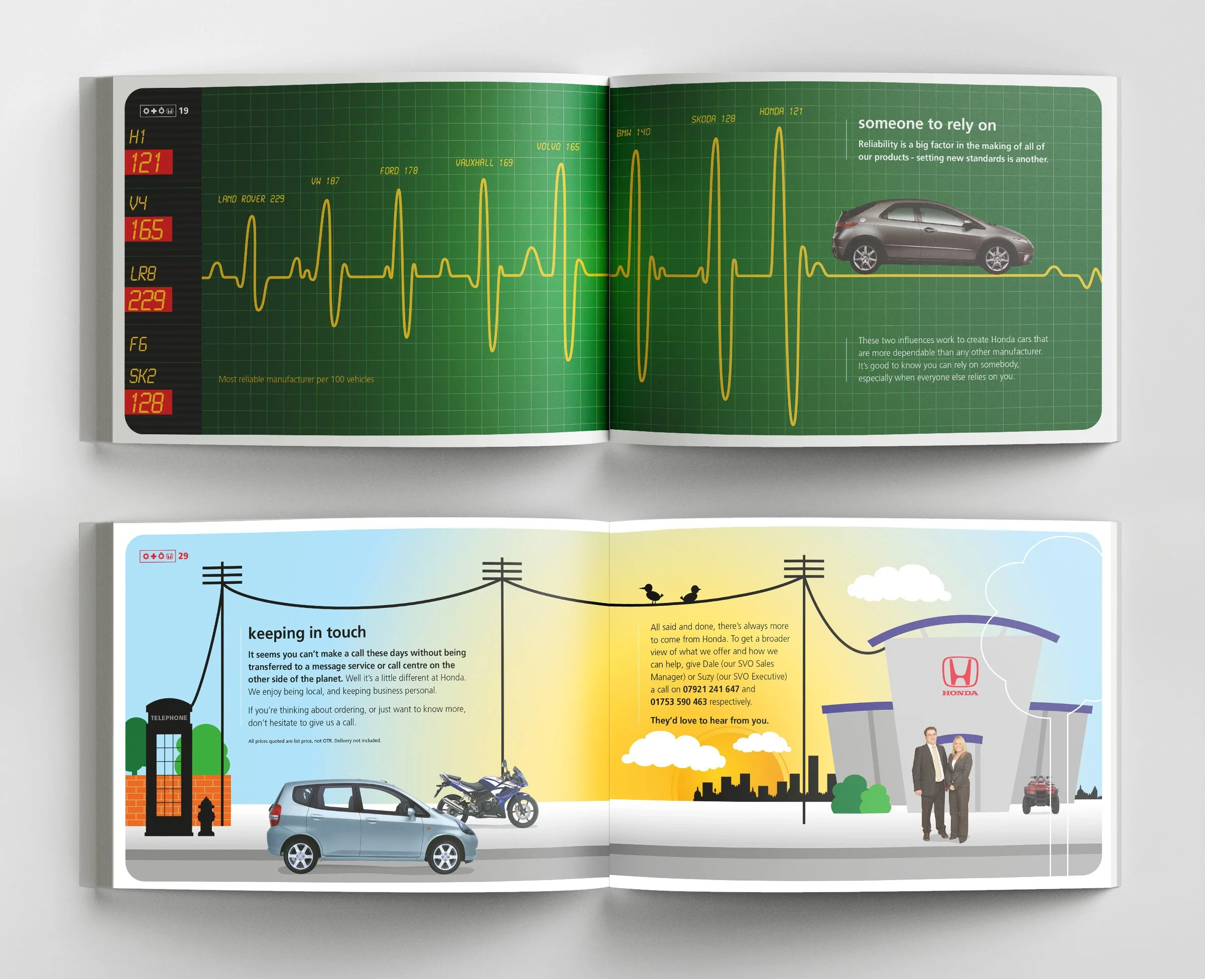 Honda is renowned for it’s fun, irreverent personality. We created a series of charming illustrations that communicated the key benefits of choosing Honda’s fleet vehicles.